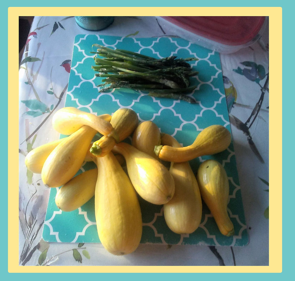 So nice to come down the stairs this morning and find a pile of yellow squash on the counter. I asked my daughter to pick the squash yesterday, but we were in quite an upheaval over a car wreck my son had in TX. I forgot I had even asked her to do it. (Dear son is fine!) My daughter blessed me by honoring my request when I couldn't remind her to do it. I put the asparagus in the picture, too. Can't believe that asparagus bed is still producing here in NC!